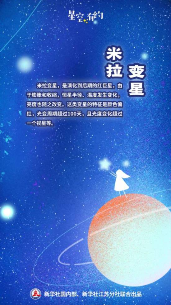 “脉动变星又分为很多类型,如造父变星、米拉变星等。”王科超说,仙后座R星所属的米拉变星,是演化到后期的红巨星,由于膨胀和收缩,恒星半径、温度发生变化,亮度也随之改变。这类变星的特征是颜色偏红,光变周期通常超过100天,且光度变化超过一个视星等。