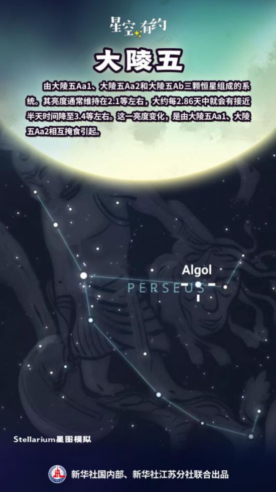 食变星中的“明星”,有英仙座中的第二亮星大陵五。王科超介绍,大陵五是由大陵五Aa1、大陵五Aa2和大陵五Ab三颗恒星组成的系统。其亮度通常维持在2.1等左右,大约每2.86天中就会有接近半天时间降至3.4等左右。这一亮度变化,是由大陵五Aa1、大陵五Aa2相互掩食引起的。